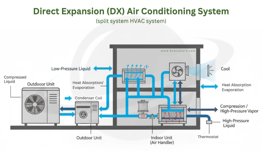 Unitary HVAC systems use direct expansion (DX), where refrigerant absorbs or rejects heat through a coil as air passes across it. In these systems, the compressor and condenser are located either in a packaged unit or in a separate outdoor unit, while the evaporator coil is located in the airstream. A fan delivers conditioned air through ductwork into the space.